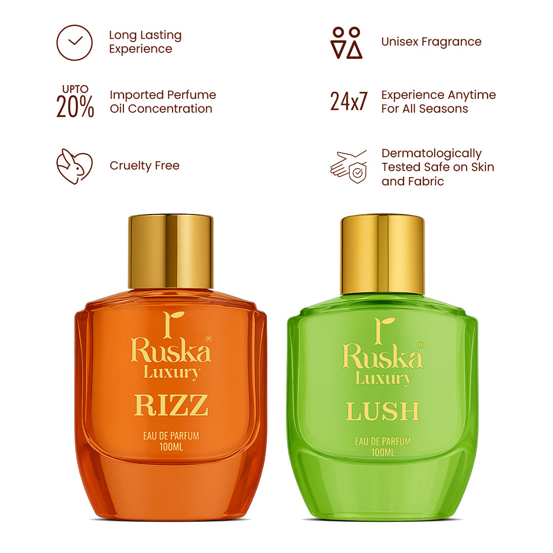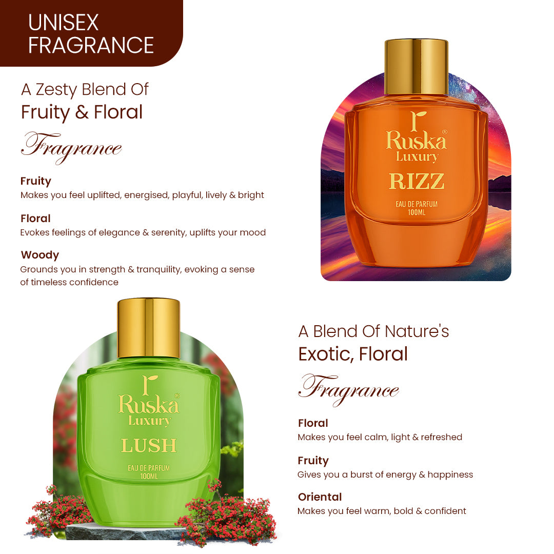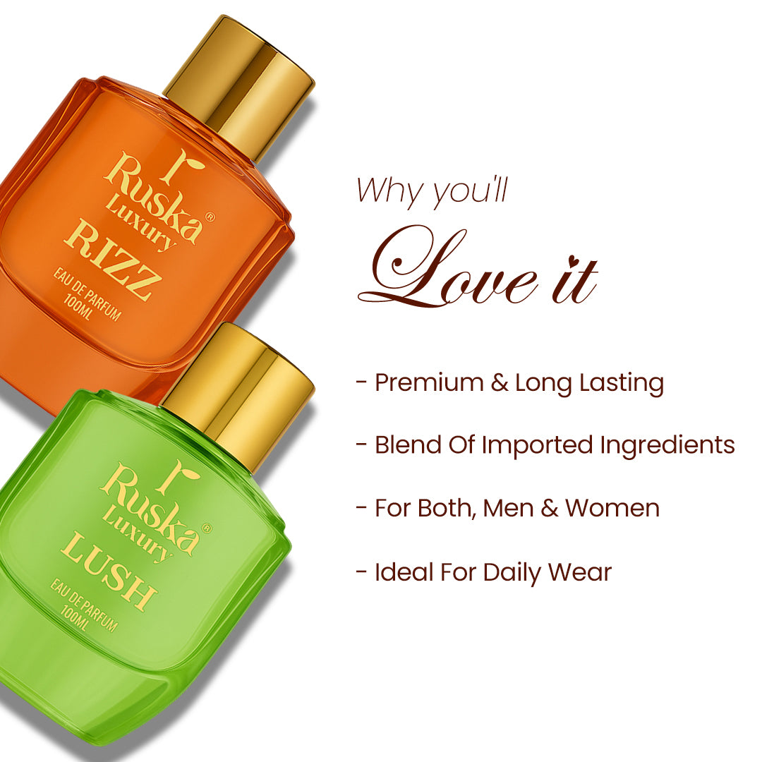 Ideal for Every Occasion: Both LUSH and RIZZ Eau de Parfums offer unique blends of floral, citrus, and warm woody notes, making them perfect for any occasion. Whether you're attending a daytime event, a casual outing, or a sophisticated evening gathering, these luxurious fragrances ensure you make a lasting impression with every spritz.